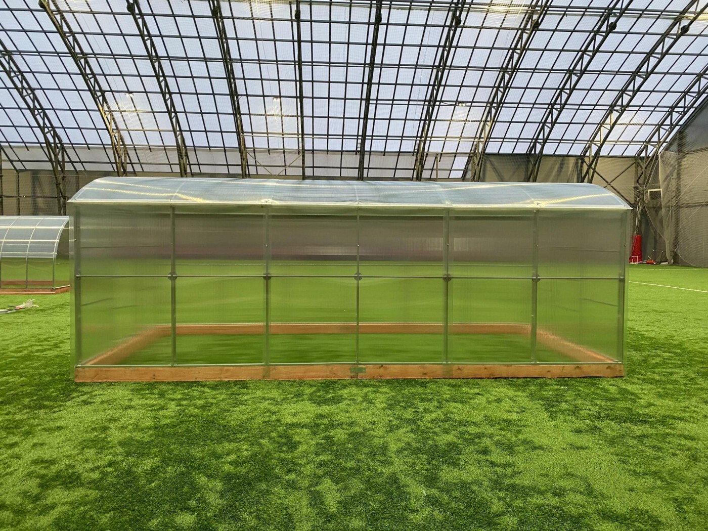 Szklarnia ma proste ściany zapewniające w pełni dostępną przestrzeń roboczą.